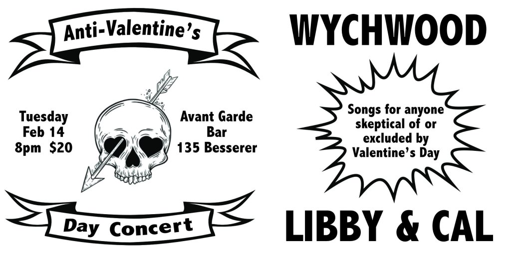 Come join us for an Ant-Valentine’s Day Show and Get Together featuring music from Wychwood (old songs about rejecting or escaping conventional romance, sometimes tragically but more often happily) and Libby & Cal (new songs about alternative love). Tuesday February 14, 2023 Doors 7:30pm, start 8pm Avant-Garde Bar (135 Besserer St.) Tickets: $15 e-transfer to info@wychwood.xyz or $20 to eventbrite $20 at the door, or PWYC, cash or e-transfer Pay-what-you-can at the door or in advance by sending an email to info@wychwood.xyz or direct message us on socials.